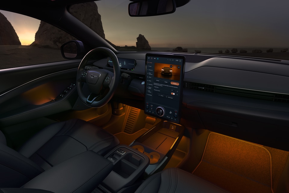 The new Ford Mustang Mach-E hits the road with a robust infotainment system, powered by Ford's robust SYNC infotainment suite. This includes a 15-inch infotainment display, along with coveted media apps like wireless Apple CarPlay, Android Auto, and more. That "more" can include access to built-in Wi-fi, as well as a luxurious 10-speaker Bang & Olufsen sound system.
