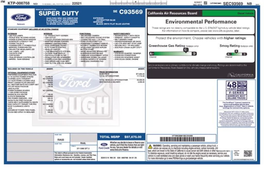 CALL NOW 908-835-8100, 4WD. 2025 Ford F-250SD Platinum Platinum 6.7L High Output Power Stroke V8 Diesel 4WD Antimatter Blue Metallic Price includes: $2000 - Retail Customer Cash