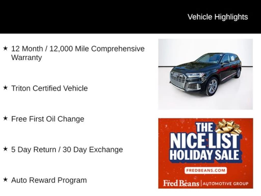 CARFAX One-Owner. Clean CARFAX. 2023 Audi Q7 55 Premium quattro 3.0L TFSI 8-Speed Automatic with Tiptronic quattro 4D Sport Utility Black Metallic For better peace of mind all our used vehicles have a 127-point inspection and come with a 5-day return, 30-day exchange (As-Is vehicles are excluded). Our exclusive Auto Rewards Program provides better value with Free First Oil change, Free Pa State Safety inspections, discounts for local merchants and more. Plus, you can earn up to $2000 towards your next vehicle just by servicing with Fred Beans! As Fred Beans always says, our used cars are better because our reputation depends on it.