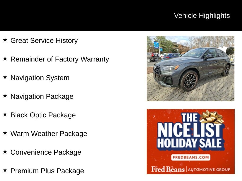 2023 Audi SQ5 Sportback Premium Plus quattro 3.0L TFSI 8-Speed Automatic with Tiptronic quattro 4D Sport Utility Daytona Gray Pearl Effect Great Service History, Remainder of Factory Warranty, Audi Active Lane Assist, Audi Virtual Cockpit Plus, Bang & Olufsen 3D Sound System, Black Exterior Mirror Housings, Black Exterior Trim, Black Optic Package, Convenience Package, Hands-On Detection Steering Wheel, Leather Seating Surfaces, Leatherette Covered Center Console, Navigation Package, Navigation System, Premium Plus Package, Radio: MMI Navigation Plus, Rear Manual Side Window Shades, Top View Camera System, Traffic Jam Assist, Ventilated Front Seats, Warm Weather Package, Wheels: 20" 5-V Spoke-Star Design.