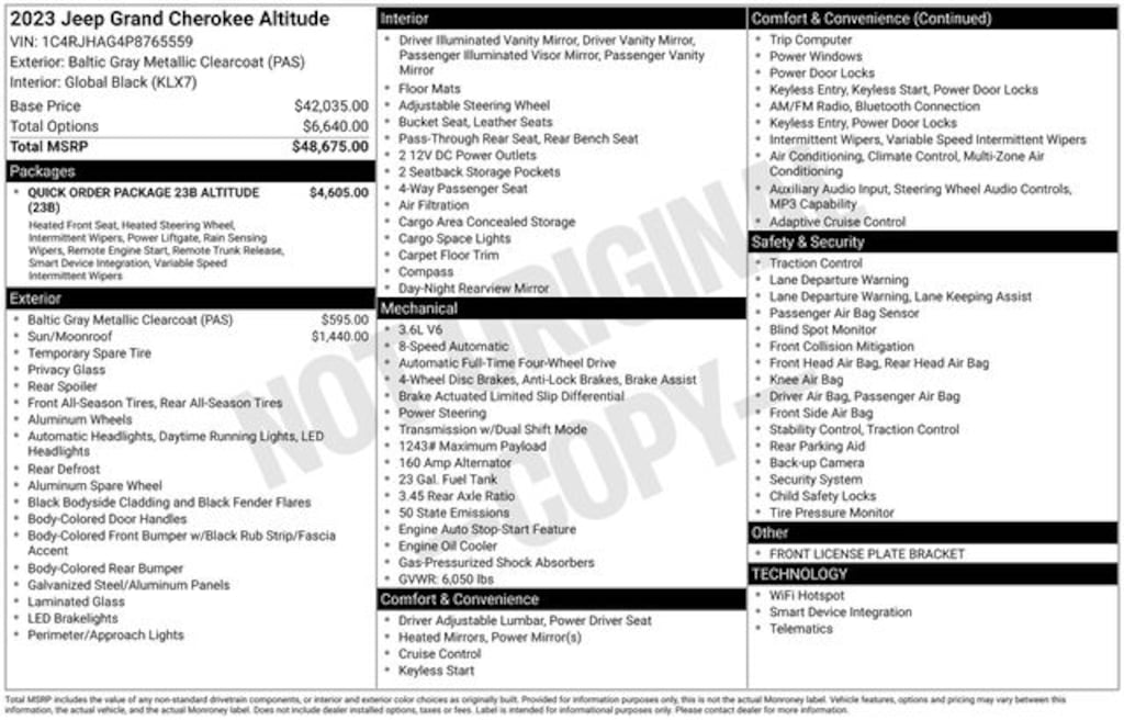 2023 Jeep Grand Cherokee Altitude 3.6L V6 24V VVT 8-Speed Automatic 4WD 4D Sport Utility Baltic Gray Metallic Clearcoat Local Trade, 3 Month / 4,000 Mile Comprehensive Warranty, Ford Blue Advantage Certified, 115-Volt Auxiliary Power Outlet, Altitude Appearance Package, Automatic temperature control, Black Headliner, Capri Leatherette Seats w/Suede, Delete Laredo Badge, Front Bucket Seats, Front dual zone A/C, Gloss Black Exterior Accents, Gloss Black Roof Rails, Heated door mirrors, Heated front seats, Heated steering wheel, ParkView Rear Back-Up Camera, Power door mirrors, Power driver seat, Power Liftgate, Power Sunroof, Power windows, Quick Order Package 23B Altitude, Radio: Uconnect 5 w/8.4" Flush Display, Rain-Sensing Windshield Wipers, Rear window defroster, Rear window wiper, Remote keyless entry, Remote Start System, Secondary Active Grille Shutters, Selectable Tire Fill Alert, Speed control, Wheels: 20" x 8.0" Gloss Black Aluminum, Wireless Charging Pad. 19/26 City/Highway MPG