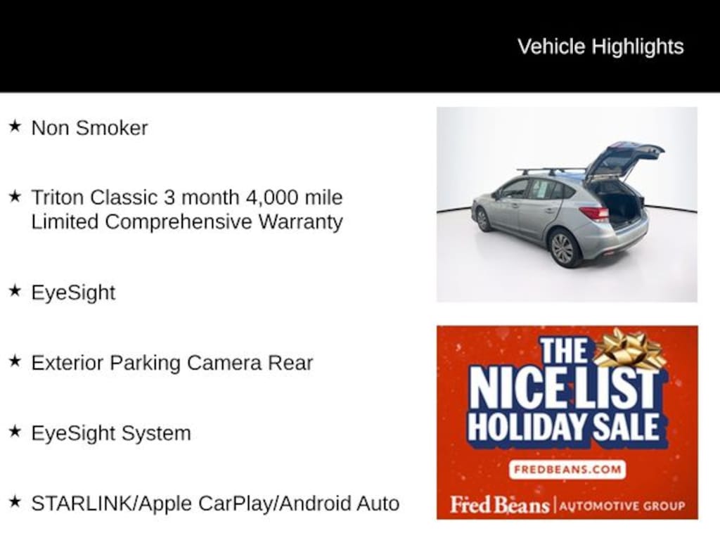 Recent Arrival! 2019 Subaru Impreza 2.0i 2.0L DOHC CVT Lineartronic AWD 4D Hatchback Ice Silver Metallic Non Smoker, Triton Classic 3 month 4,000 mile Limited Comprehensive Warranty, Exterior Parking Camera Rear, EyeSight, EyeSight System, STARLINK/Apple CarPlay/Android Auto.